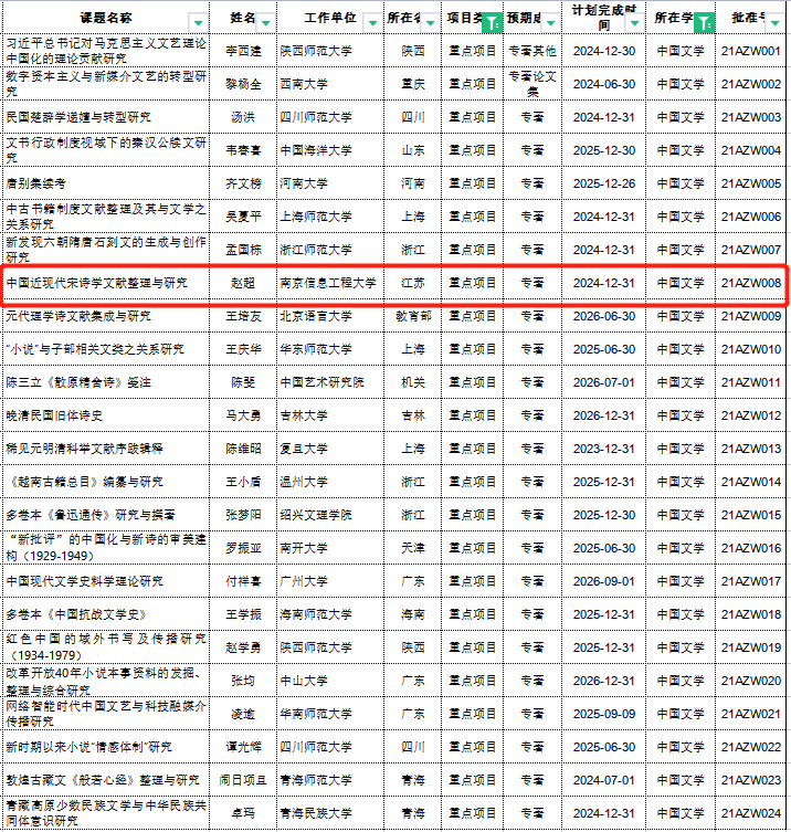 2021年9月24日全国哲学社会科学工作办公室正式公布了2021年国家社科基金年度项目立项名单,我院赵超副教授申报的“中国近现代宋诗学文献整理与研究”获批中国文学学科重点项目立项,实现了36365线路检测中心no1国家社科基金重点项目零的突破,也是本年度江苏省中国文学学科唯一重点项目立项。