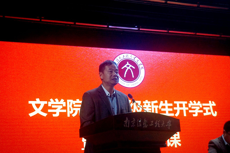 中文系系主任张丽娟老师作为教师代表发言。她首先引用诗经里的一句诗:“既见小萌新们,云胡不喜”表达了对新同学的欢迎和喜悦之情。她说,学校坐落于“世界文学之都”南京,风景优美、名师辈出,希望学子们珍惜难得的求学机会,怀抱着“为天地立心,为生民立命,为往圣继绝学,为万事开太平”的梦想,志存高远,以“格物致知,正心诚意,修身齐家,治国平天下”为己任,为从青春梦想的启航点出发,奋起追梦。